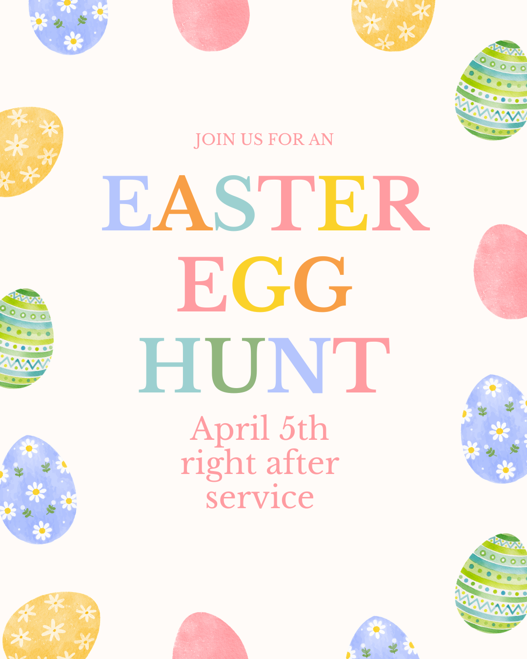 After the morning service is our annual children’s Easter Egg Hunt!
